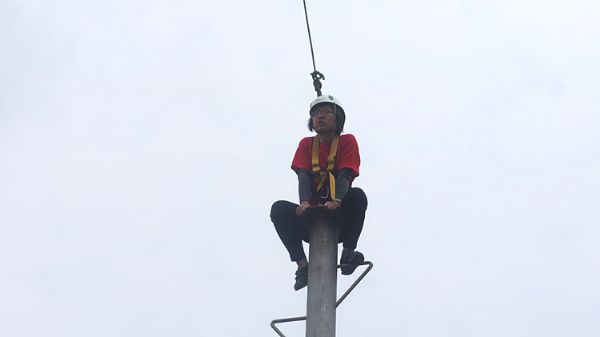 (在隊員的鼓勵下,邱小紅勇敢爬上桿頂)