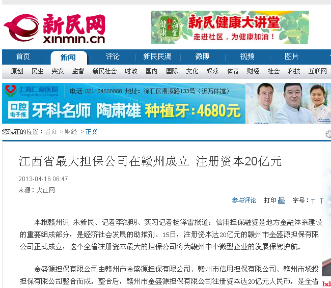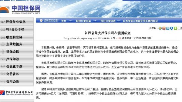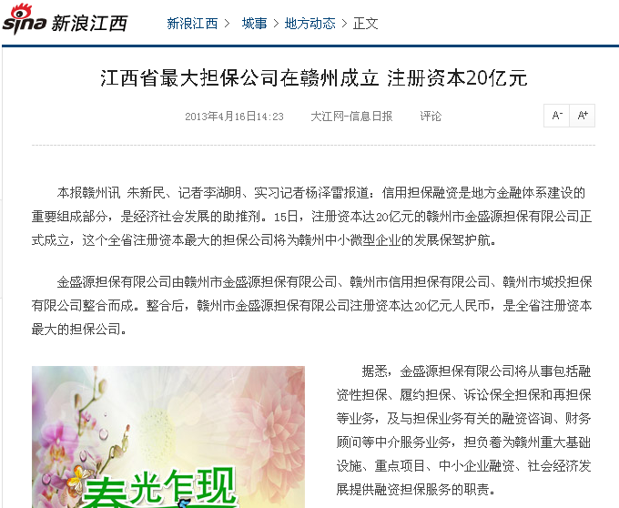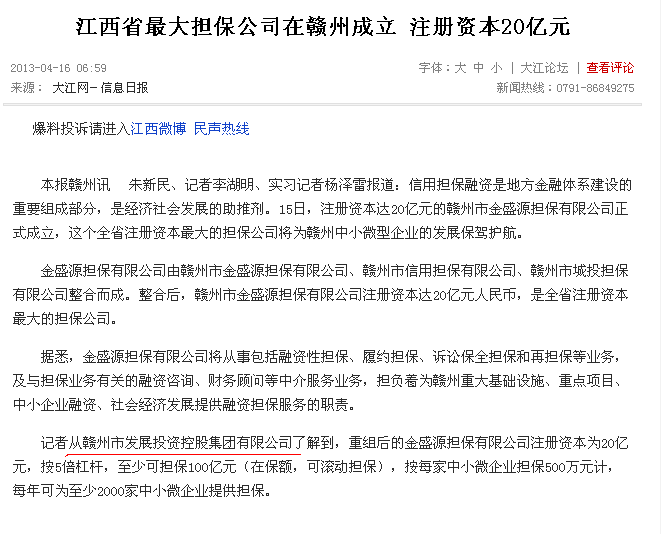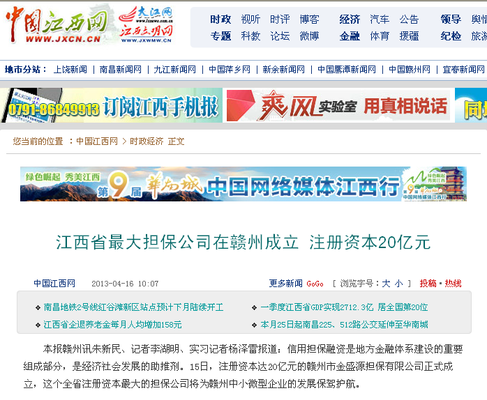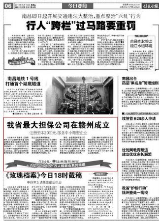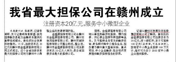 【信息日報】江西最大擔保公司在贛州成立 注冊資本20億元