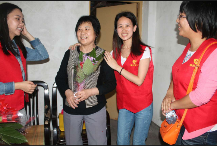 (志愿者為秦奶奶獻上鮮花,表達美好的祝福)