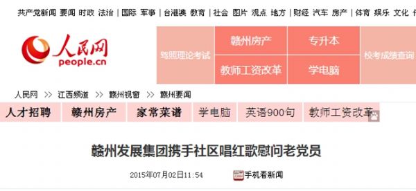 2015年7月3日,中國江西網也圖文刊發了《贛州發展集團攜手社區唱紅歌慰問老黨員》新聞。