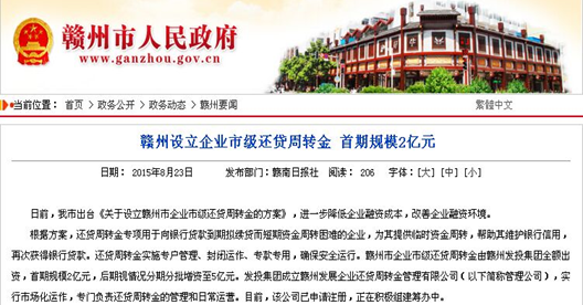為貫徹落實我市企業扶持政策,優化企業融資環境,降低企業融資成本,根據市政府相關文件精神,贛州發展集團公司受命組建贛州發展企業還貸周轉金管理有限公司(下稱“還貸周轉金公司”),現籌建工作正穩步推進。