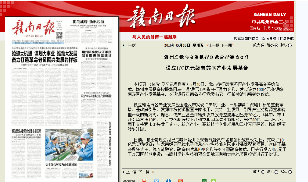 5月19日,贛州發(fā)展投資控股集團(tuán)與交通銀行發(fā)起設(shè)立了總規(guī)模100億元的交銀贛南蘇區(qū)產(chǎn)業(yè)發(fā)展基金簽約儀式在贛州發(fā)展投資控股集團(tuán)舉行。儀式結(jié)束當(dāng)天上午《客家新聞網(wǎng)》第一時(shí)間頭條刊文報(bào)道,而且就基金設(shè)立的意義、發(fā)起設(shè)立方式與目前已取得的階段性成果作了重要陳述。此次簽約儀式同樣引起《贛南日?qǐng)?bào)》、《贛州晚報(bào)》、贛州新聞聯(lián)播等媒體界的廣泛關(guān)注。
