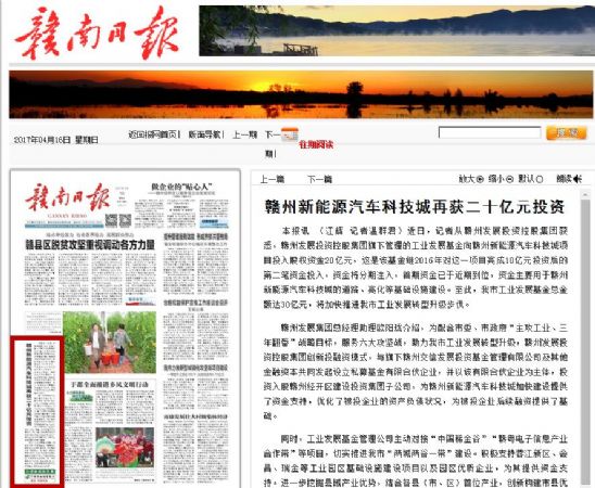 《贛南日報》:贛州新能源汽車科技城再獲二十億元投資
