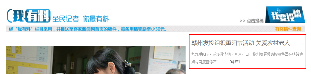 10月28日,《客家新聞網(wǎng)》“我有料”欄目刊發(fā)集團(tuán)重陽節(jié)關(guān)愛農(nóng)村老人宣傳報(bào)道。