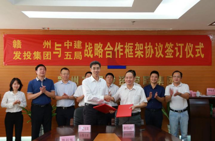9月29日,集團與中國建筑第五工程局有限公司(中建五局)舉行戰略合作框架協議簽約會,雙方就在贛州市基礎設施建設、地產開發、設備融資租賃、主材供應等深化合作方面進行了洽談,并簽訂了《贛州市投資開發、基礎設施建設項目戰略合作框架協議》,合作規模約100億元。集團黨委副書記、董事長李賤貴,中建五局黨委書記、董事長田衛國代表雙方簽約。