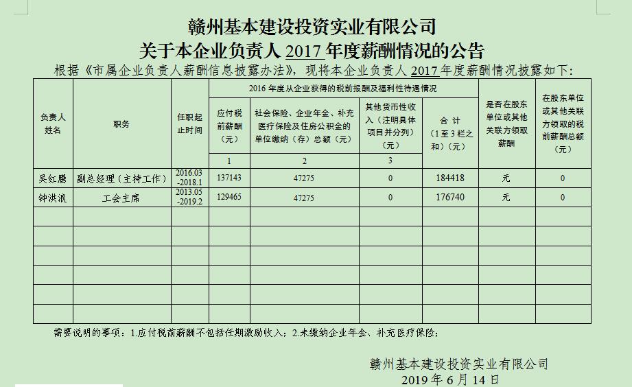 贛州基本建設投資實業有限公司 關于本企業負責人2017年度薪酬情況的公告