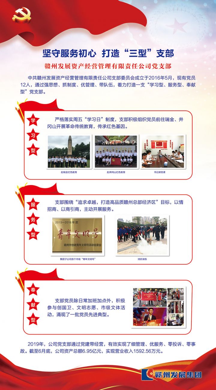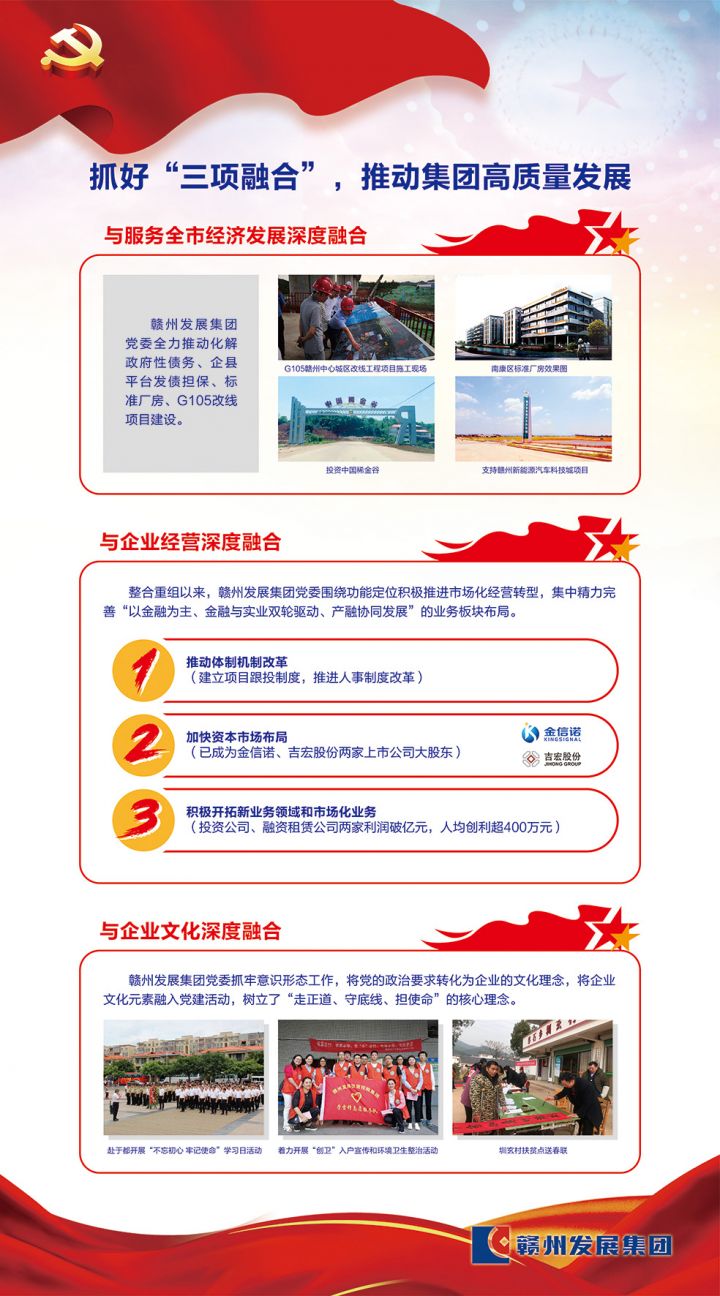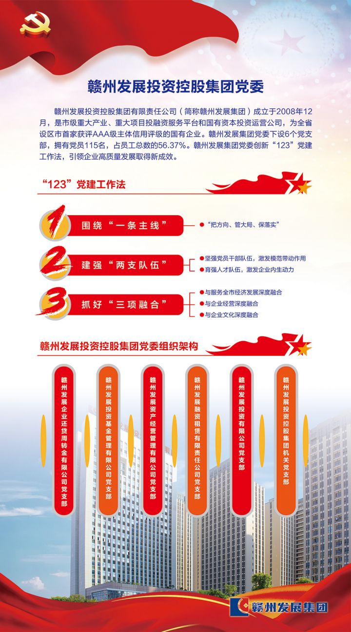 整合重組以來,集團黨委認真貫徹落實《中共贛州市委關于開展基層黨建質量提升行動的實施意見》、市國資系統基層黨建質量提升工作推進會精神,堅持“企業黨建做實了就是生產力、做強了就是競爭力、做細了就是凝聚力”這一黨建工作理念,充分發揮黨委政治核心作用,緊扣工作實際,創新“123”黨建工作法,引領企業高質量發展取得新成效。
