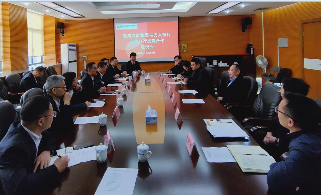 2019年12月4日,光大銀行南昌分行黨委書記、行長(zhǎng)章國(guó)華率隊(duì)蒞臨集團(tuán)考察洽談。集團(tuán)黨委書記、董事長(zhǎng)李賤貴、集團(tuán)領(lǐng)導(dǎo)廖生興等出席洽談。