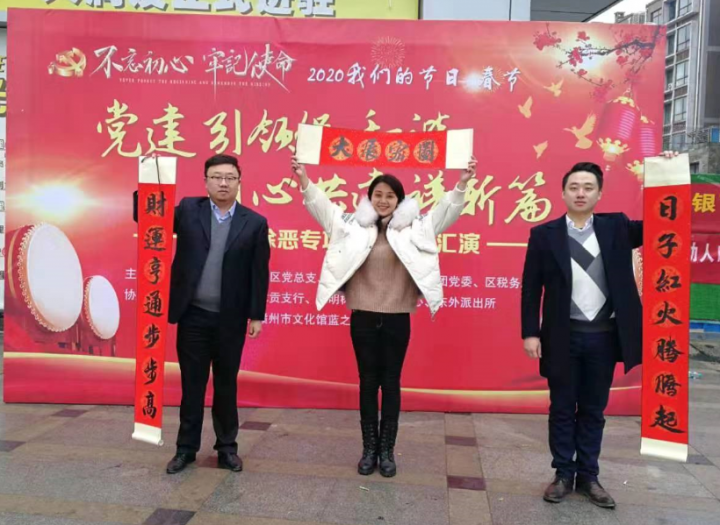 次日,贛州發投集團黨委和社區黨總支共同舉辦了“黨建引領促和諧 同心共建譜新篇‘不忘初心、牢記使命’”春節文藝匯演。在寒風瑟瑟的演出現場,集團員工黃博滔、閆曉龍冒著細雨熱情洋溢地為觀眾獻上了歌曲“紅旗飄飄”,并向現場觀眾表達誠摯的新春祝福,獲得了在場觀眾熱烈地掌聲。