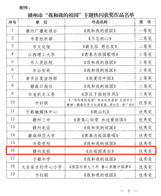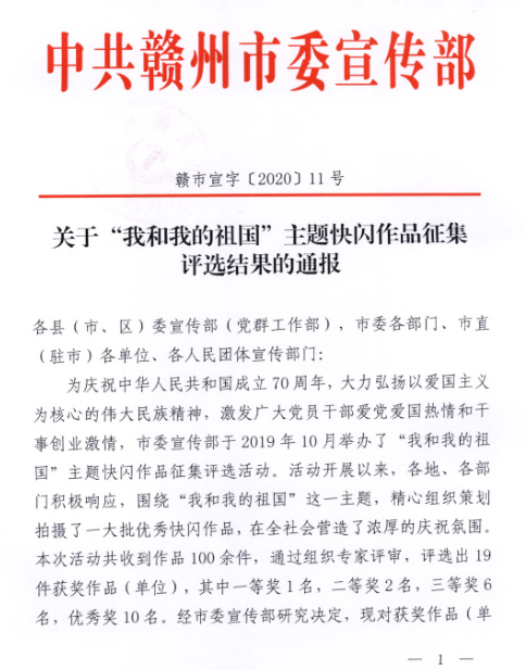 4月7日,中共贛州市委宣傳部印發《關于“我和我的祖國”主題快閃作品征集評選結果的通報》,集團選送的作品《向祖國表白》,從100余件作中脫穎而出,榮獲“優秀獎”。