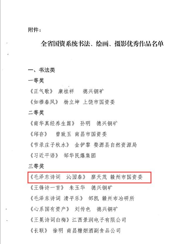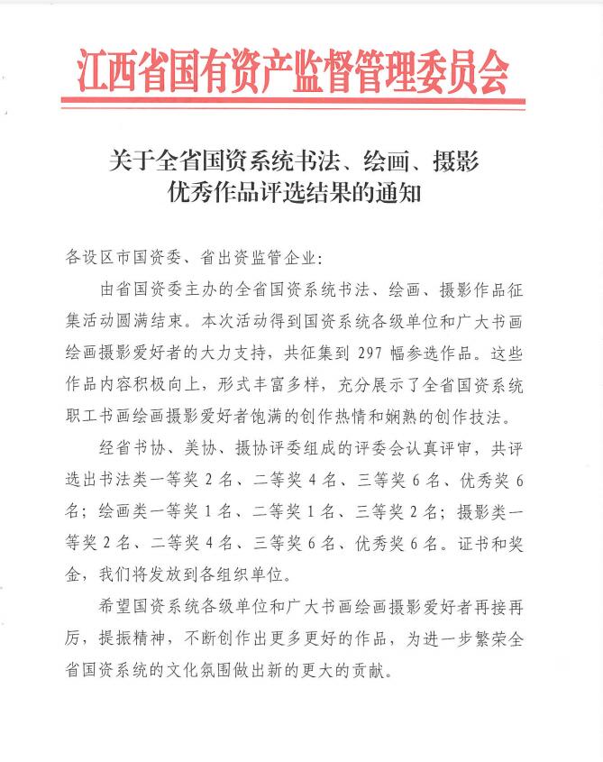 近日,江西省國(guó)資委公布了《關(guān)于全省國(guó)資系統(tǒng)書(shū)法、繪畫(huà)、攝影優(yōu)秀作品評(píng)選結(jié)果的通知》,集團(tuán)選送的書(shū)法作品——《毛澤東詩(shī)詞 沁園春》(作者:廖天茂)榮獲書(shū)法類(lèi)“三等獎(jiǎng)”。