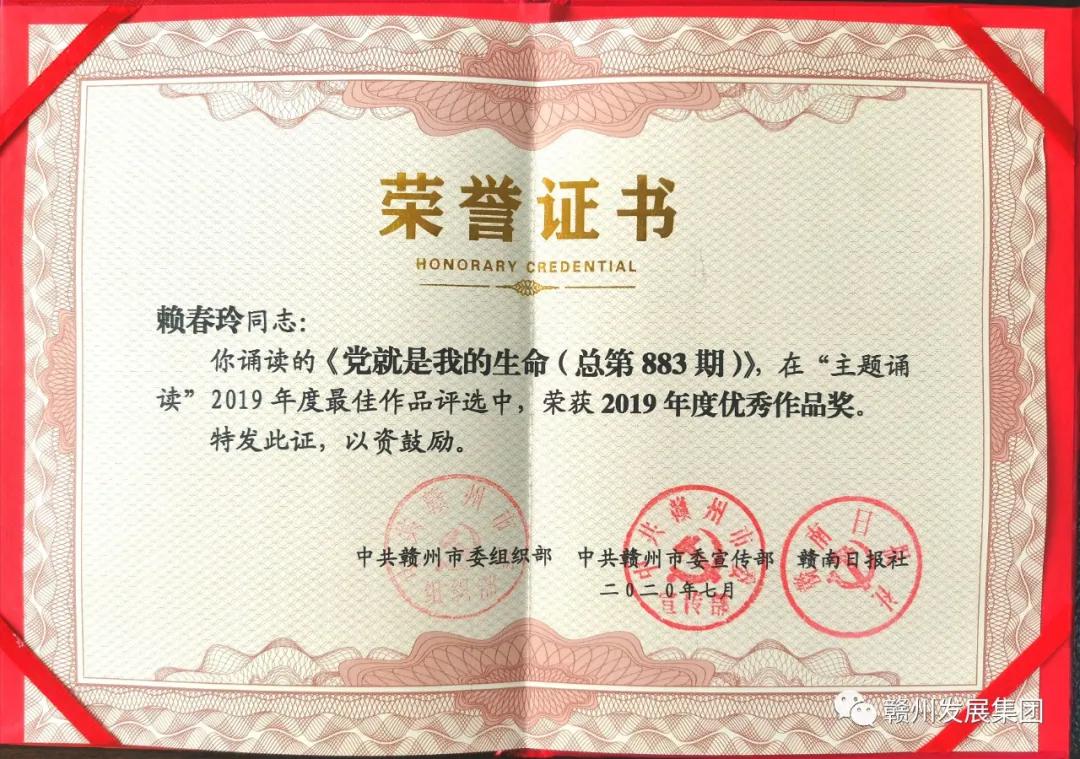 贛州發(fā)展融資租賃公司黨支部選送“主題誦讀”作品榮獲全市“年度優(yōu)秀作品獎”