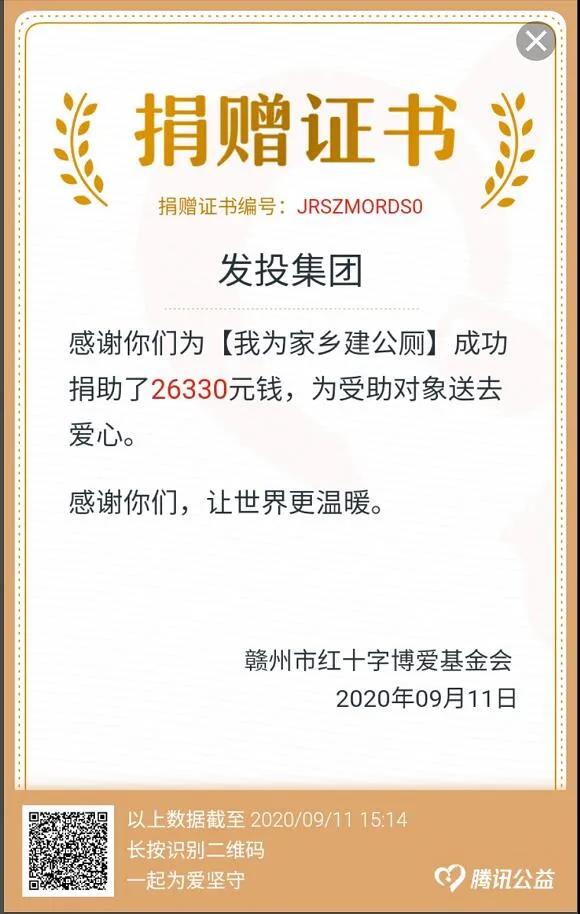 9月7日至10日,贛州發展集團組織全體干部職工開展“我為家鄉建公廁”暨“99公益日”一起捐活動。集團每名干部、職工按照“多捐不限”的原則以及“每月捐贈10元的工資收入或零花錢,一年捐贈120元”的標準,通過手機微信掃描騰訊公益平臺定制專屬二維碼的方式踴躍捐贈。截止9月11日下午6時,共計募捐金額26330元。