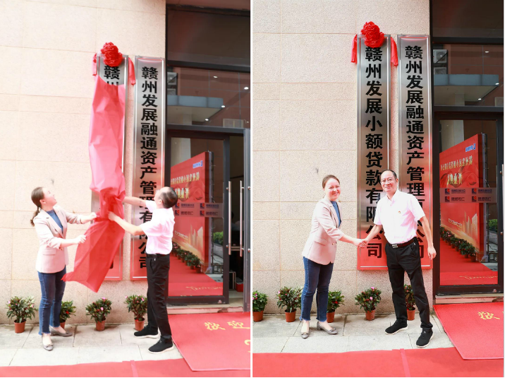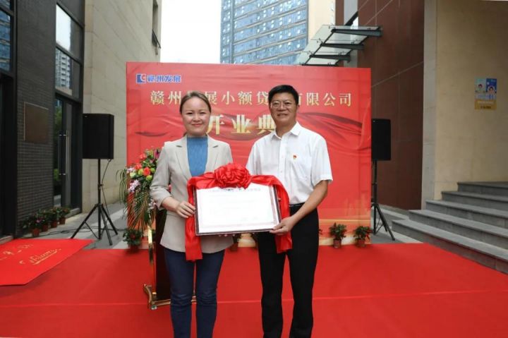 市金融辦副主任楊蕙宇與集團黨委書記、董事長李賤貴共同為贛州發(fā)展小額貸款有限公司揭牌。