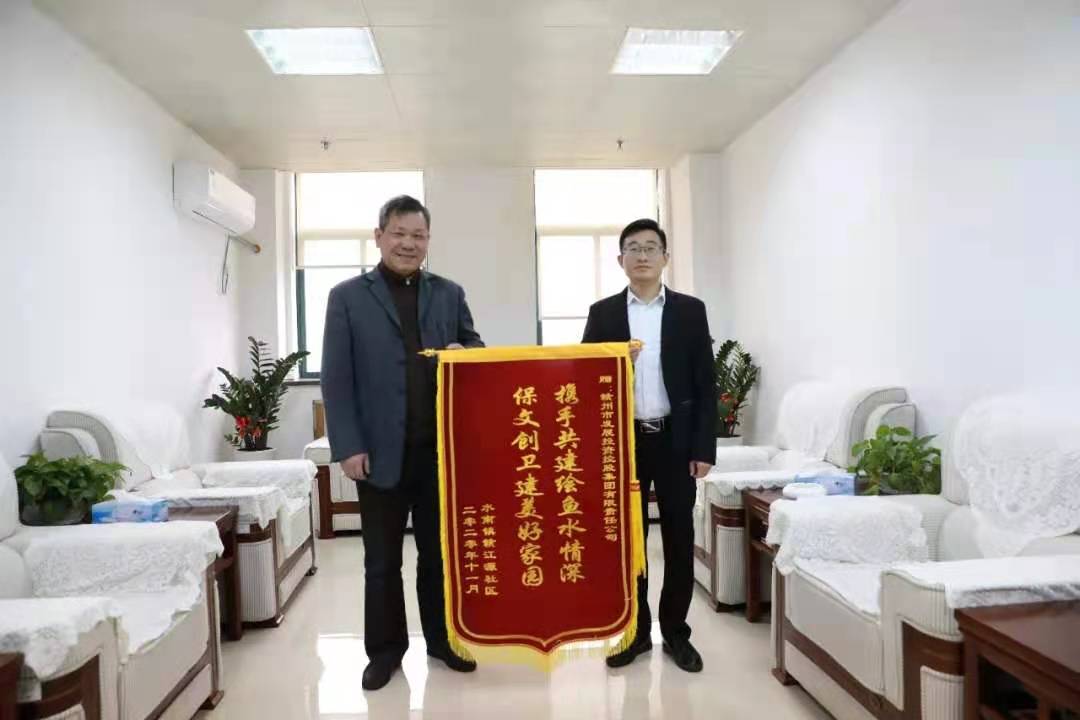 贛江源社區黨支部書記將寫有“攜手共建繪魚水情深 保文創衛建美好家園”的錦旗送到了集團黨委副書記肖春雷手中。肖春雷表示,送來的是錦旗,擔起的是責任!贛州發展集團將一如既往地積極踐行國有企業社會責任,發揮應有的作用,助力共建美好家園。