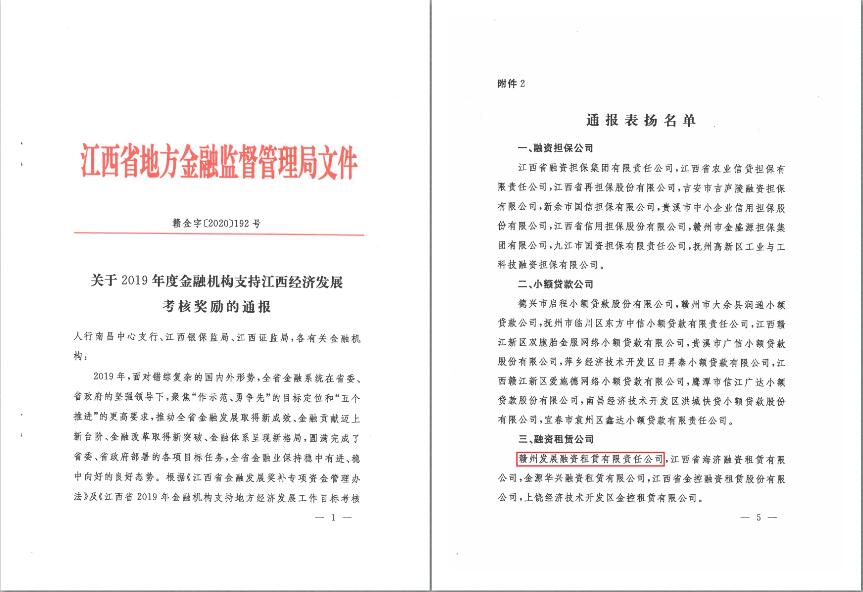 近日,江西省地方金融監督管理局下發贛金字(2020)192號《關于2019年度金融機構支持江西經濟發展考核獎勵的通報》,贛州發展集團旗下融資租賃公司獲得通報表揚,體現了監管機構及社會各界對融資租賃公司服務地方經濟社會發展所做工作的肯定。