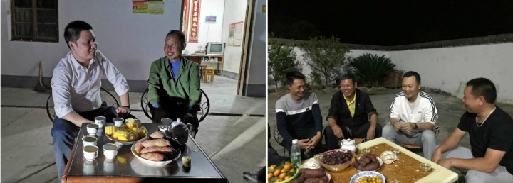晚上,扶貧干部來到各自貧困戶家中,一起夜話家常,大家圍坐在一起邊吃邊聊,其樂融融。