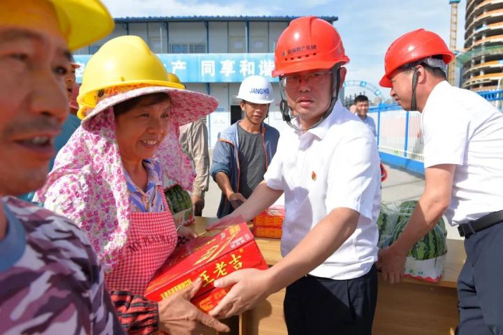 參加活動的慰問組黨員代表共10余人,帶著西瓜、葡萄、王老吉等解暑水果、涼茶、藥品,來到“嘉福中心”等項目,現場慰問驕陽下揮汗如雨的工人們,為他們送去一絲清涼、一縷關懷。