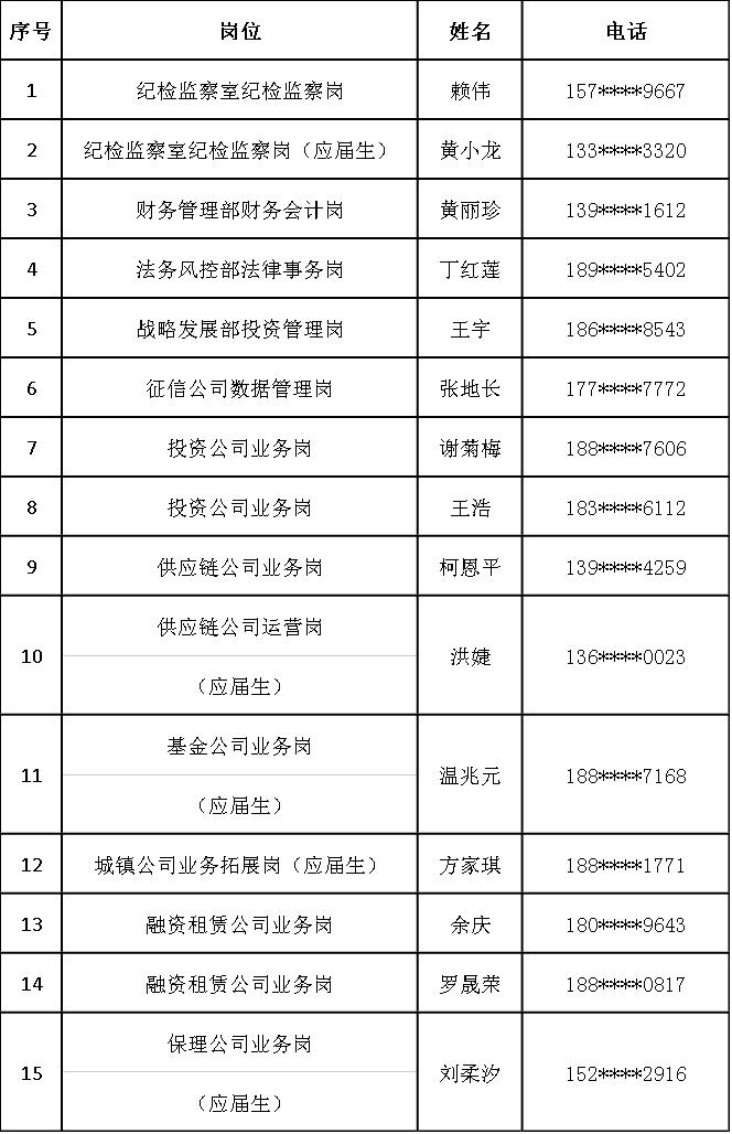 根據《贛州發展投資控股集團公開招聘公告》要求,通過公開報名、簡歷初審、資格審查、筆試、面試(其中研究生單獨兩輪面試)、體檢與背調等程序,經研究,確定以下15名同志為擬錄用人員,現予以公示: