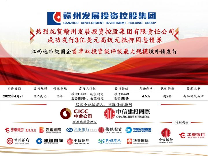 4月7日,在兩家知名國際評級機構分別給予投資級債項評級(穆迪Baa3 、惠譽BBB- )的基礎上,贛州發展投資控股集團順利完成首期3億美元3年期高級無抵押固息債券的發行定價,票面利率4.5%。得益于前期充分的路演推介及持續的基石訂單夯實工作,本次債券發行受到市場高度關注,投資者認購踴躍,最終取得超2倍的認購倍數。