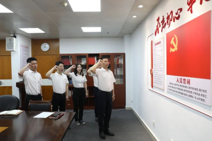 面向鮮紅的黨旗,黃強右手握拳高舉過肩,帶領4名新發展預備黨員和各黨支部黨員代表莊嚴宣誓:“我志愿加入中國共產黨,擁護黨的綱領……隨時準備為黨和人民犧牲一切,永不叛黨。”鏗鏘有力的誓言,在黨員活動室內激昂回蕩。
