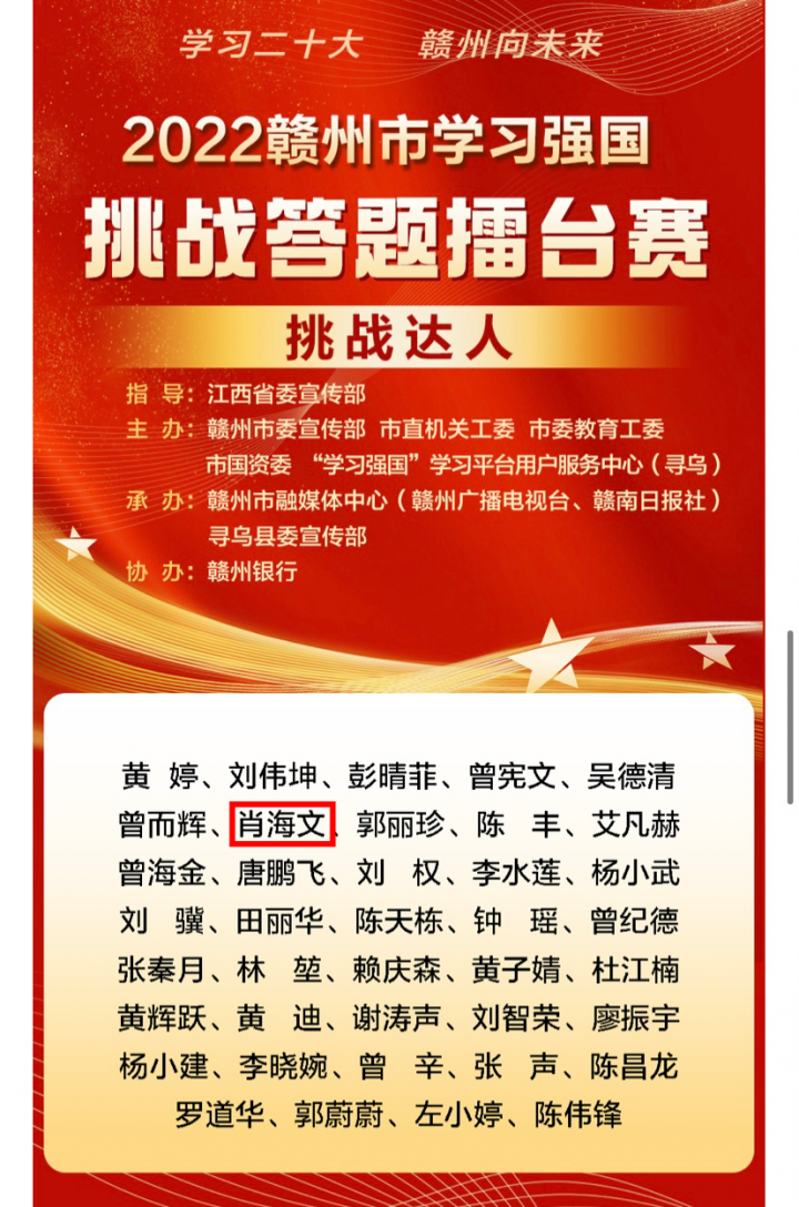 在此次比賽中,市國資委代表隊獲得團體三等獎,贛州發展集團肖海文被選派代表市國資系統參加全市總決賽并獲得個人三等獎以及“挑戰達人”稱號。此前,肖海文曾獲得2022年度贛州市國資系統“學習強國”知識競賽個人一等獎。