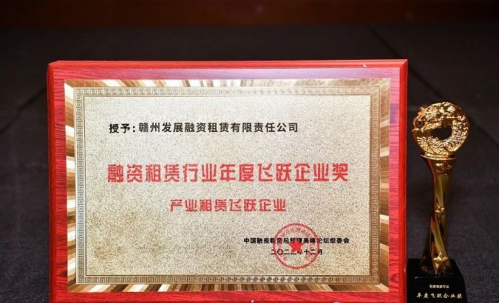 近日,“2022中國融資租賃總經理高峰論壇金鼎獎頒獎盛典”在上海隆重舉行!贛州發展集團旗下融資租賃公司憑借企業聲譽、綜合實力和行業影響力榮獲融資租賃行業年度飛躍企業獎之“產業租賃飛躍企業”獎項。