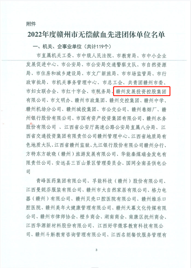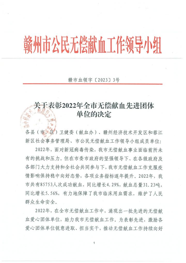 6月6日,贛州市公民無償獻血工作領導小組印發《關于表彰2022年全市無償獻血先進團體單位的決定》(贛市血領字[2023]3號),贛州發展集團被評為“2022 年度贛州市無償獻血先進團體單位”。