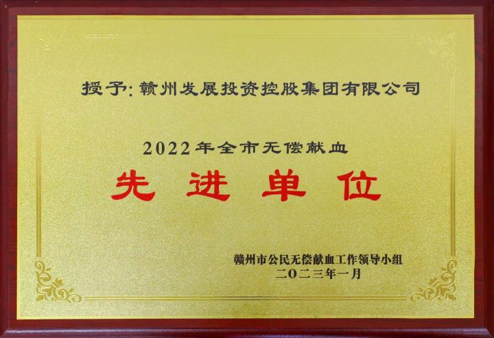 喜訊!贛州發展集團被評為“2022年度贛州市無償獻血先進團體單位”