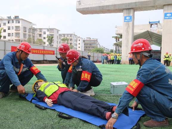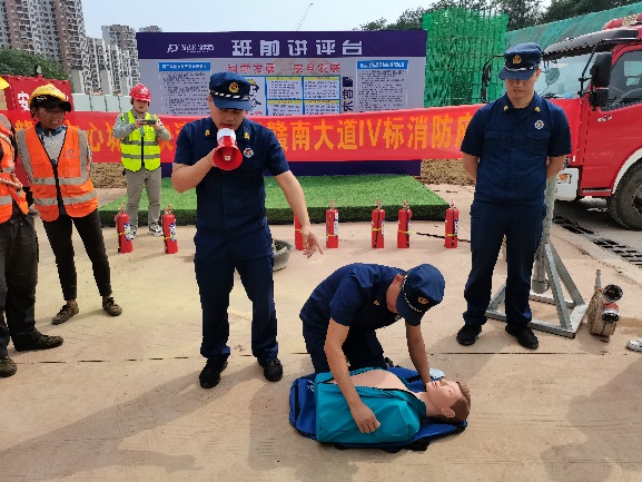 贛州市中心城區(qū)快速路工程—贛南大道Ⅲ標、贛南大道Ⅳ標蓉江段、東江源大道快速化改造工程項目現(xiàn)場根據(jù)快速路施工特點和潛在的各類風險隱患,有針對性地分別開展了快速路施工高處墜落、物體打擊、高溫中暑等事故應急救援和消防應急演練活動,并邀請了贛州市消防救援大隊教官和人民醫(yī)院醫(yī)護人員進行現(xiàn)場急救教學。