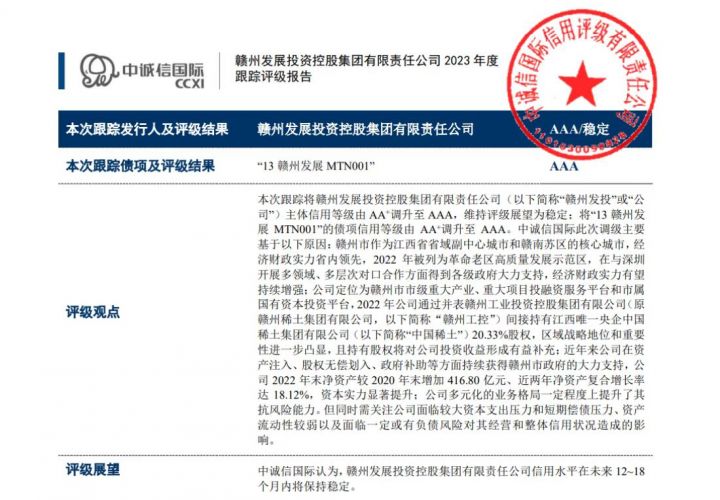 重磅!贛州發(fā)展投資控股集團喜獲中誠信AAA主體信用評級