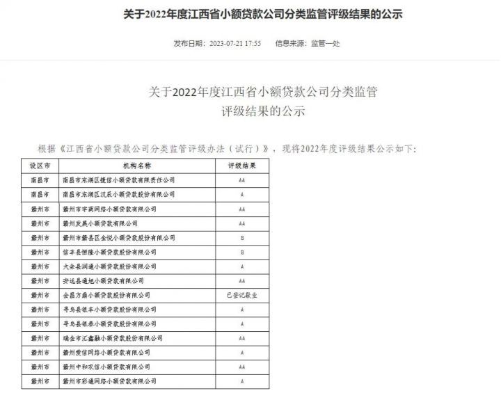 贛州發展小額貸款公司獲2022年度江西省小額貸款公司分類監管“AA”評級