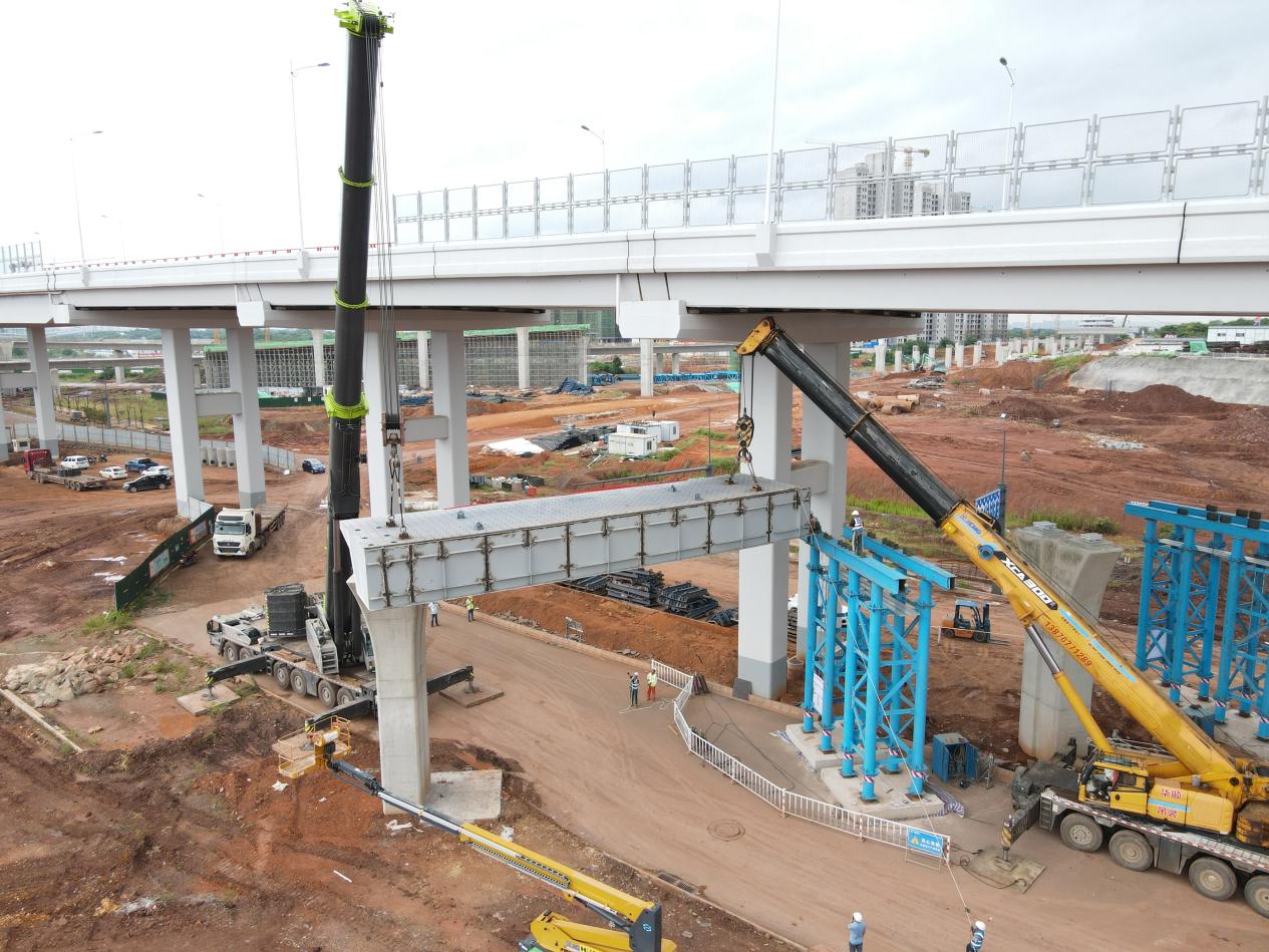 近日,武陵大道二標快速路工程(杜鵑花路至黃金大橋東側段)項目蓉江三路立交首聯鋼箱梁歷經17個小時吊裝協同作業后順利完成架設,標志著橋梁上部結構施工正式拉開序幕。