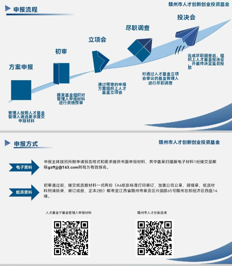 設立人才基金,是深入實施人才強市戰略的重要支撐,旨在吸引更多優秀人才扎根贛南、奉獻贛南、成就贛南,打造全國重要人才集聚中心和創新高地。人才基金的設立,填補了我市“投早、投小”的創投類產業基金空白,將極大助力贛州打造“從小到大、由傳統到創新”的全周期產業基金體系,推動科技創新賦能,引領經濟體系創新發展。記者采訪獲悉,人才基金的主要申報流程共5個,分別是方案申報、初審、立項、盡調和投決,現已開通線上申報方式。