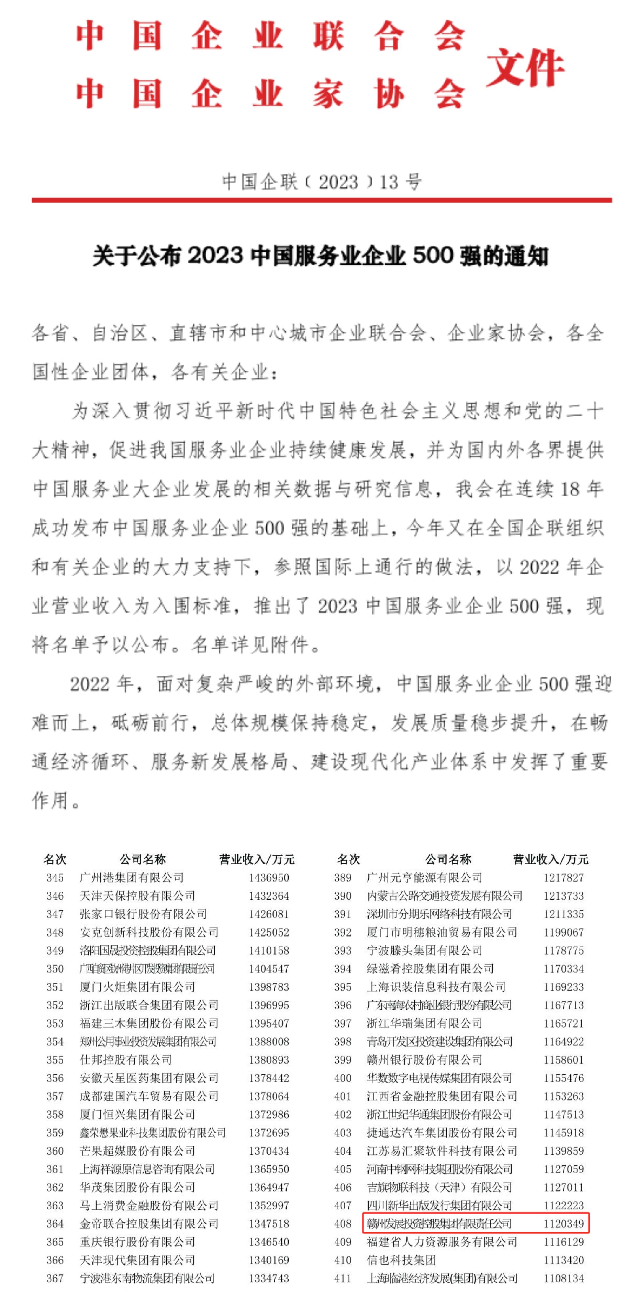 近日,中國企業(yè)聯(lián)合會(huì)、中國企業(yè)家協(xié)會(huì)以企業(yè)2022年?duì)I業(yè)收入為入圍標(biāo)準(zhǔn),發(fā)布了“2023中國服務(wù)業(yè)企業(yè)500強(qiáng)”,贛州發(fā)展投資控股集團(tuán)有限公司榮列中國服務(wù)業(yè)企業(yè)500強(qiáng)第408位,系集團(tuán)2021年榮列中國服務(wù)業(yè)企業(yè)500強(qiáng)后再次入圍。