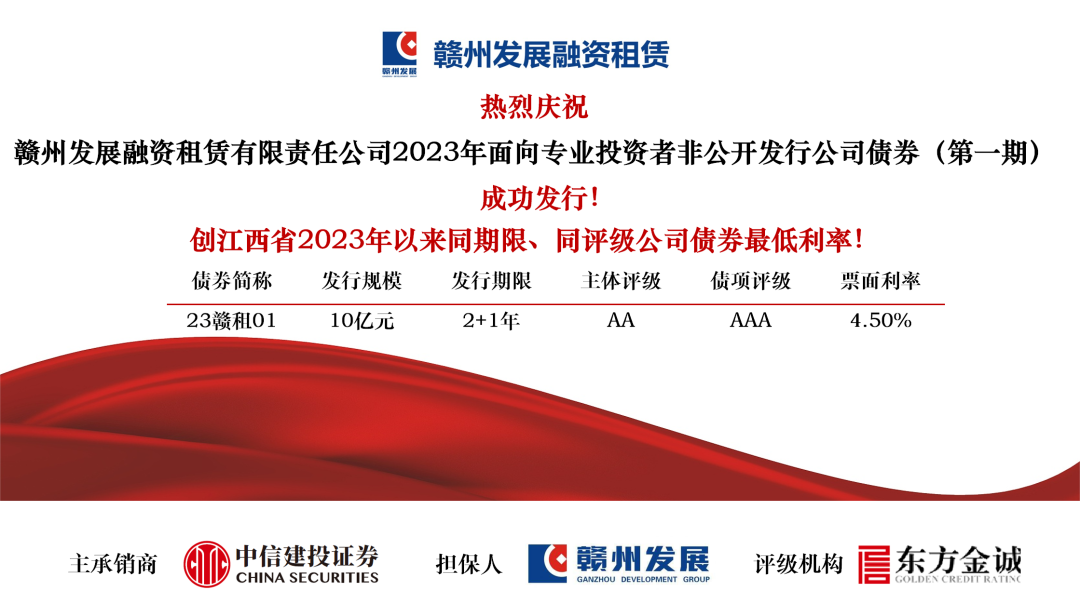 10月23日,贛州發展融資租賃有限責任公司成功發行2023年度第一期非公開發行公司債券,發行規模10億元,發行期限2+1年,票面利率為年化4.50%,本期債券利率創江西省2023年以來同期限、同評級主體公司債券最低水平,充分展現了市場投資者對租賃公司的高度認可。