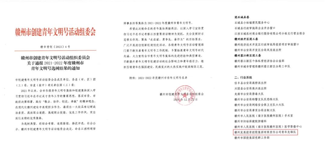 近日,贛州市創建青年文明號活動組委會印發《關于通報2021-2022年度贛州市青年文明號選樹結果的通知》,集團青年先鋒隊獲評2021-2022年度“贛州市青年文明號”榮譽稱號。