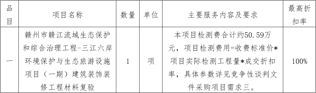 贛州市贛江流域生態(tài)保護(hù)和綜合治理工程-三江六岸環(huán)境保護(hù)與生態(tài)旅游設(shè)施項(xiàng)目(一期)建筑裝飾裝修工程材料復(fù)驗(yàn)競(jìng)爭(zhēng)性談判采購(gòu)公告
