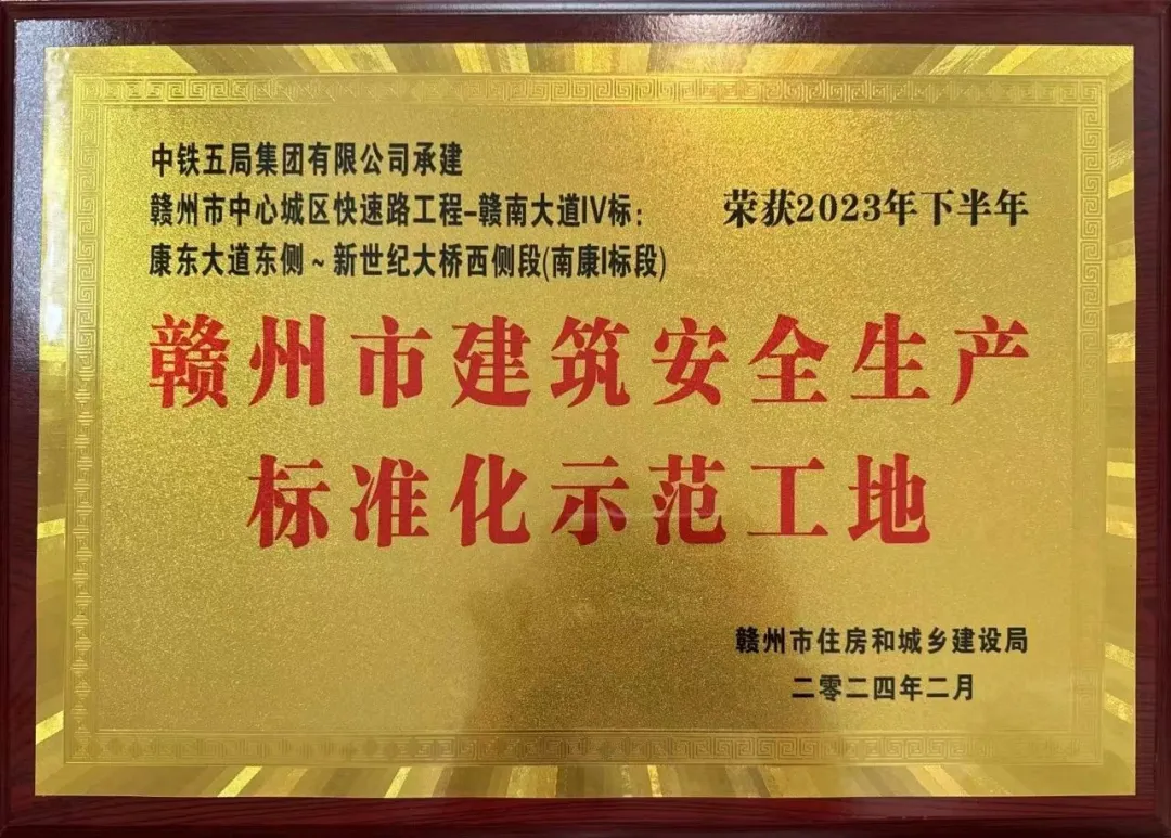 近日,從有關部門傳來喜訊,贛南大道快速路四標南康段項目榮獲贛州市住房和城鄉建設局“2023年下半年贛州市建筑安全生產標準化示范工地”榮譽稱號。