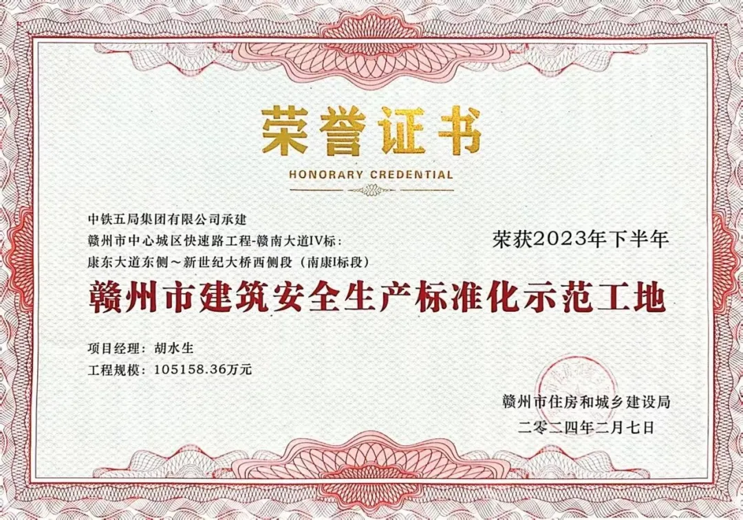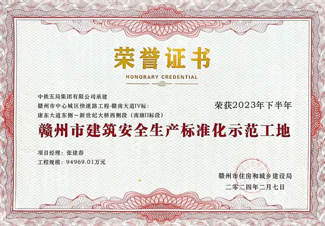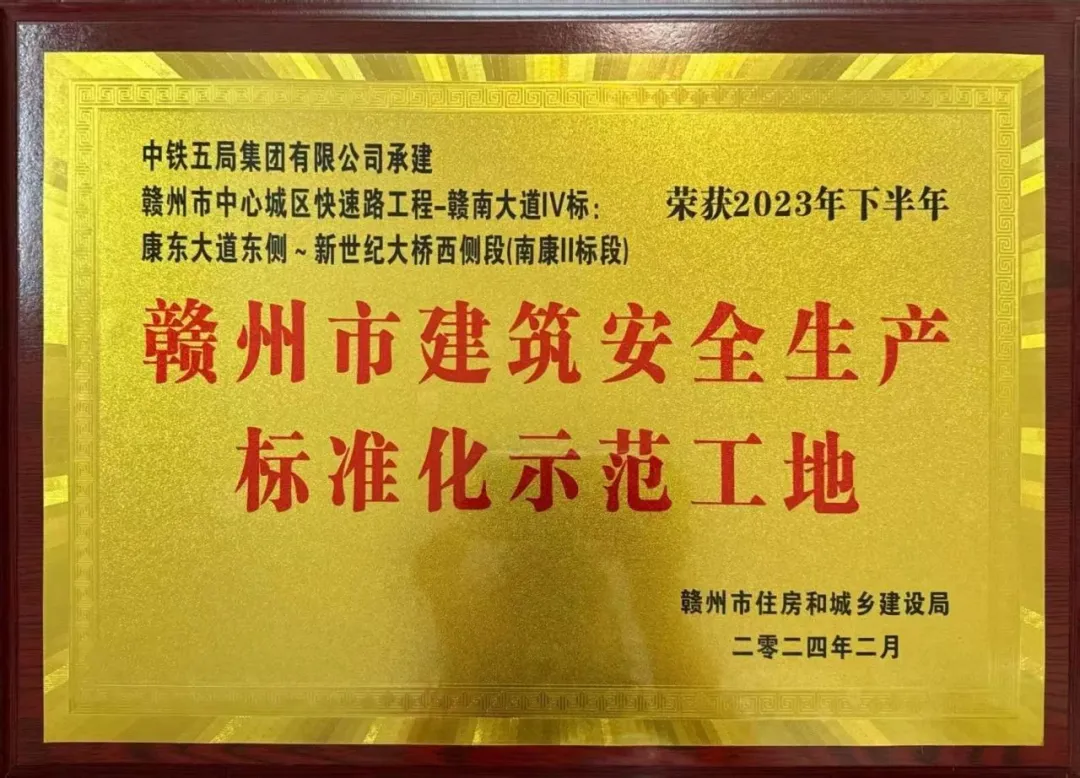 喜訊!贛南大道快速路項目榮獲“2023年下半年贛州市建筑安全生產標準化示范工地”稱號