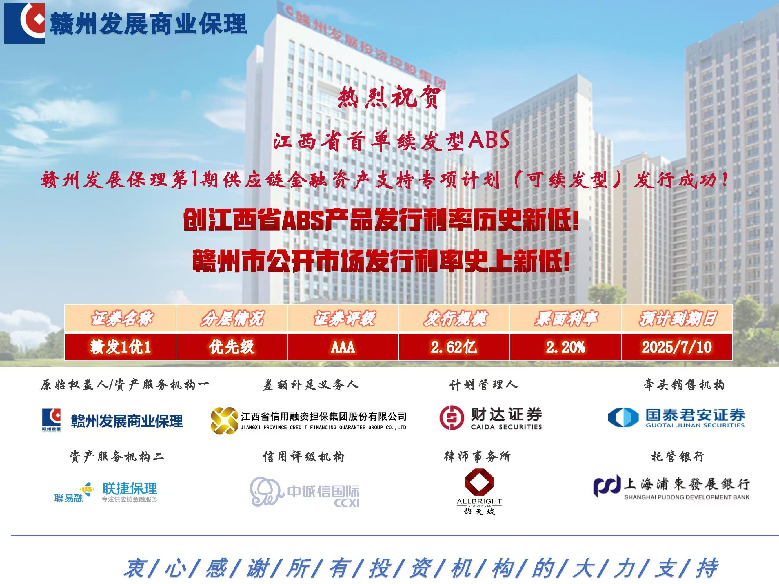 8月5日,贛州發(fā)展集團(tuán)旗下保理公司“贛州發(fā)展保理第1期供應(yīng)鏈金融資產(chǎn)支持專項(xiàng)計(jì)劃(可續(xù)發(fā)型)”成功簿記!簿記發(fā)行規(guī)模2.63億元,期限1年,其中優(yōu)先級(jí)規(guī)模2.62億元,評(píng)級(jí)AAAsf,票面利率2.2%。8月9日募資全部到位。本產(chǎn)品系江西省首單續(xù)發(fā)型ABS,發(fā)行利率創(chuàng)江西省ABS產(chǎn)品發(fā)行利率歷史新低,創(chuàng)贛州市公開市場(chǎng)發(fā)行利率史上新低。