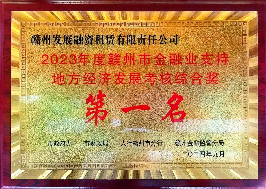 贛州發(fā)展租賃公司獲評2023年度贛州市金融業(yè)支持地方經(jīng)濟發(fā)展考核第一名