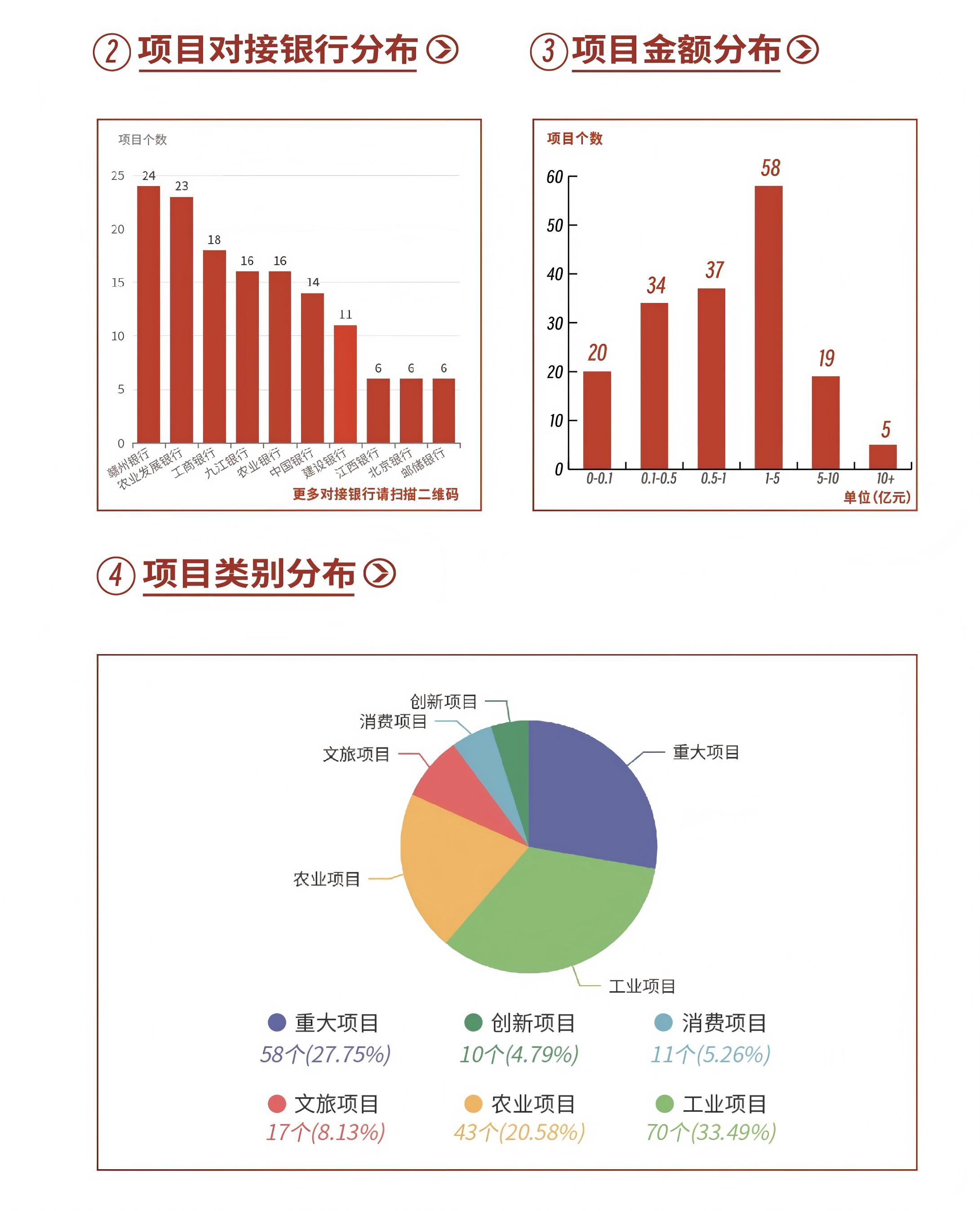 集成動態數據統計與可視化展示模塊,用戶掃碼即可實時查看全市261個項目的融資需求、區域分布、項目分布、金額分布及銀行分布等總體情況,打破信息孤島,實現數字“躍然‘碼’上”。截止目前,系統共收集項目261個,總融資需求559億元,其中,已簽約項目162個,簽約金額388億元。項目覆蓋6大行業,納入省市大中型項目共71個。