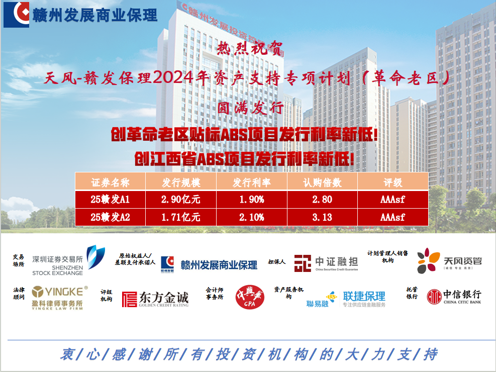 7月3日,贛州發展商業保理有限公司在深圳證券交易所成功完成簿記發行“天風-贛發保理2024年資產支持專項計劃(革命老區)”。本次發行規模達4.86億元,全場認購倍數接近3倍,獲得了市場高度認可。其中,優先級A1檔發行利率低至1.9%,創下江西省ABS發行利率歷史新低,同時也是全國革命老區貼標ABS發行利率最低紀錄。
