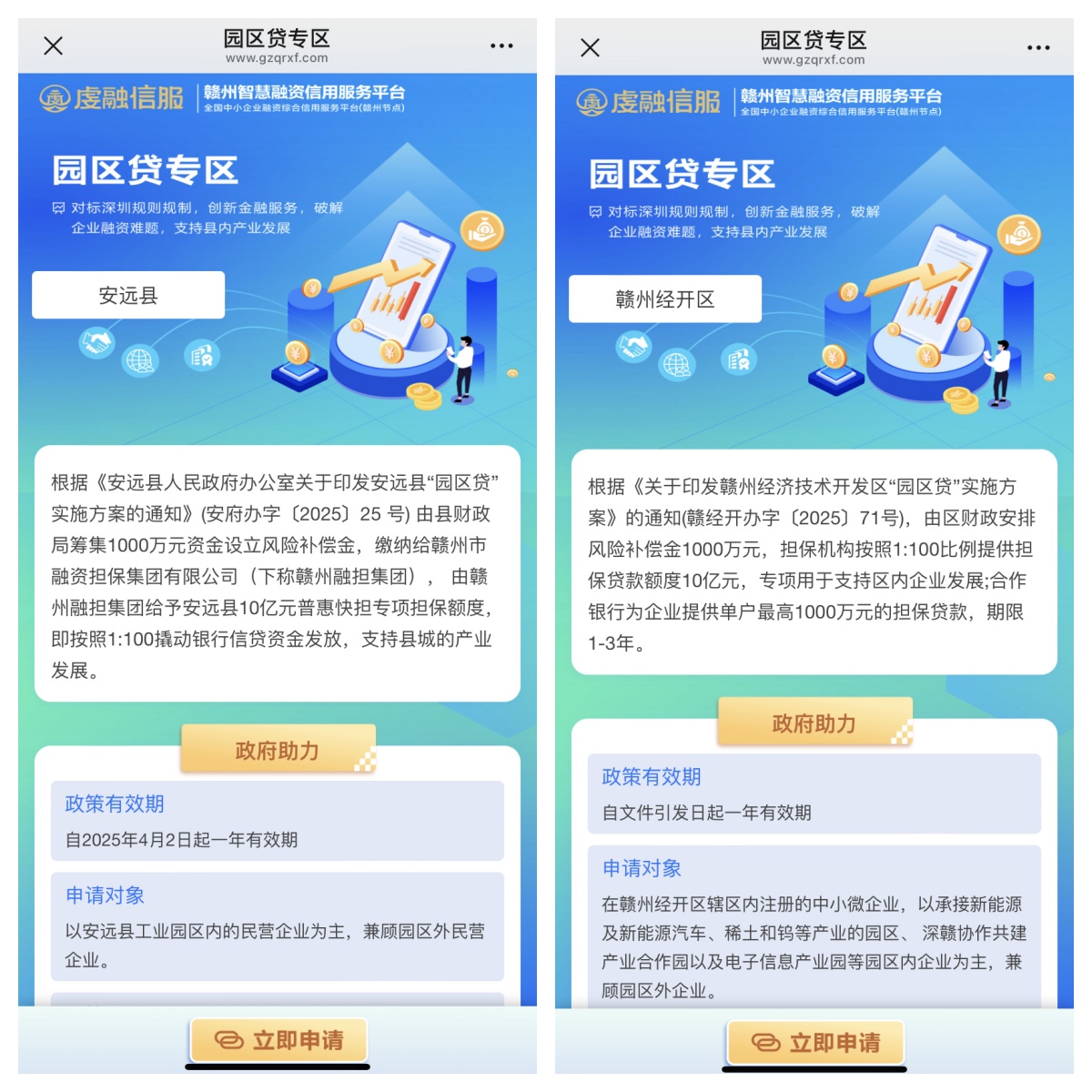 “園區貸”是破解企業融資瓶頸,助力惠企政策落地的重要成果,“虔融信服”平臺為助力緩解中小微企業“融資難、融資貴、融資慢、融資煩”等難題實行了以下重要舉措:(1)創新設計“政府提供白名單—銀行審核放款—擔保公司批量擔保”的全流程線上化業務模式。將傳統擔保業務流程全線上化,實現了全過程留痕、可視化監管、可回溯管理,助力提升政府政策運用水平,提高銀行、擔保公司審批效率,降低企業融資成本。(2)打通園區企業經營數據與政務數據壁壘,開放涉企信用信息查詢功能。平臺實現了市監、稅務、社保等多源數據整合互通;為園區開發運營公司線上提供和更新企業在園經營相關數據提供便利,向試點銀行、擔保機構等開放涉企信用信息查詢功能。(3)開發增設“園區貸”專區申請入口。平臺已實現九個縣(市、區)“園區貸”全覆蓋,目前已上線安遠縣、贛州經開區、南康區、龍南市、定南縣共五個區縣“園區貸”專區,有效實現企業“一鍵申請”和銀行線上收集融資需求、線下快速精準對接功能。截至2025年6月底,虔融信服“園區貸”專區已收到33筆共計15550萬元融資需求,銀行已授信10筆,金額達4310萬元。