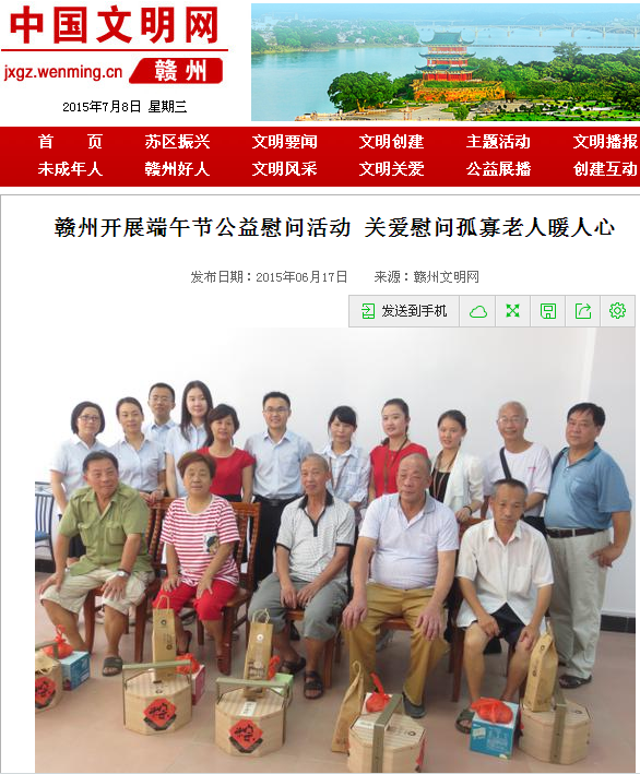 2015年6月17日,中國文明網圖文刊發了《贛州開展端午節公益慰問活動 關愛慰問孤寡老人暖人心》新聞,報道贛州發展集團開展端午節公益慰問活動。