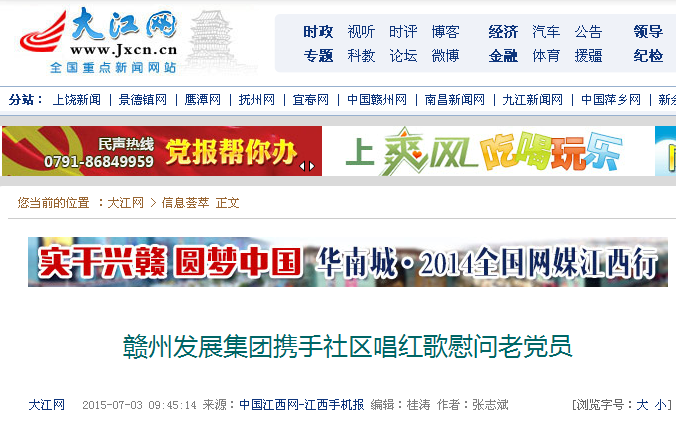 2015年7月3日,中國江西網也圖文刊發了《贛州發展集團攜手社區唱紅歌慰問老黨員》新聞。