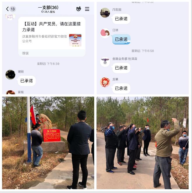 承諾如山,使命必達。集團黨委積極開展“防范疫情、從我做起”承諾活動,各黨支部紛紛響應,組織121名在職黨員進行承諾,踐行承諾。機關黨支部在疫情防控工作中,堅持“三服務”承諾,積極作為,充分應用OA辦公系統、微信群和QQ群,實施網絡辦公,搭建起跨越疫情阻隔的溝通橋梁,及時對上級疫情防控工作進行傳達部署;成立志愿服務隊,為員工采購疫情防控物資,為保證人員不聚集,志愿服務者寧愿犧牲自己休息時間,安排員工錯峰領取,切實踐行著全心全意為人民服務的宗旨。一名黨員一面旗。2月2日,南康區唐江鎮中田村紅米小組黨旗飄揚,村委會組織黨員在村民小組村口舉行了一場感人的宣誓活動,我集團機關黨支部梁煌同志鏗鏘有力的聲音在這片土地上回響:我自愿加入中國共產黨……共產黨員、召之即來、來之能戰、戰則必勝……。在南康區唐江鎮中田村疫情防控工作中,他積極加入當地疫情防控阻擊戰,大力開展政策宣講,協助鎮、村黨組織做好疫情防控宣傳,協助村里排查出入人員,以忘我的精神,切實做到了只要有任務,黨員不缺位。連日來,胥偉莉同志作為疫情防控協調聯絡人,帶病加班加點,堅持在疫情防控“幕后”,全力做好上傳下達、綜合協調工作,草擬文件、匯總表格,認真做好疫情信息研判工作。2月3日,胡華平同志發揮黨員帶頭作用,不怕臟不怕累,在城崗鄉白石村主動協助保潔員開展環境衛生整治,清理衛生死角3處,清理垃圾2車,村圩環境衛生煥然一新。