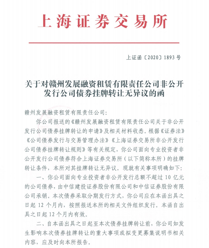 9月1日,贛州發展融資租賃有限責任公司成功取得上交所出具的非公開發行公司債無異議函,金額不超過10億元,期限3年。這是贛州發展融資租賃公司首次發行公司債,成為江西省內首家獲得上交所批準發行公司債的商業融資租賃公司,更是一次在資本市場拓寬融資渠道的重要嘗試。本次公司債發行的成功獲批,進一步打通公司直接融資渠道,有效降低資金成本。公司將進一步加強與資本市場的對接,優化融資結構,借助資本力量,不斷提升市場競爭力和品牌影響力,更好地支持實體經濟發展。