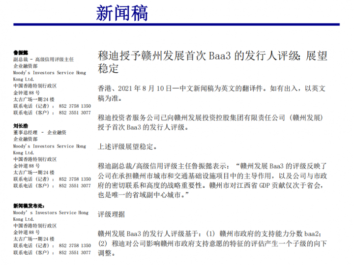 8月10日,贛州發(fā)展投資控股集團榮獲全球三大權威信用評級機構之一——穆迪投資者服務公司正式授予的Baa3(投資級)國際信用等級,評級展望為穩(wěn)定,成為江西省首家、中部六省第3家獲得穆迪投資級國際信用等級的地市級國企。